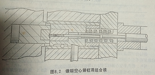 成型后的空心鉚釘被頂?shù)疥幠G懊妫豢招某尚弯N擠出空心孔的鉚釘用稱為脫模器的工具將銷。